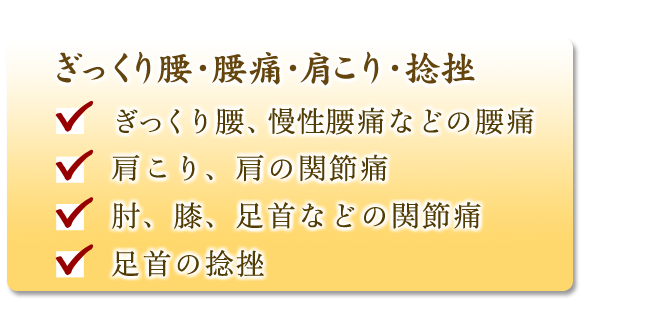 現代人の身体の悩み(ぎっくり腰、腰痛、肩こり等)に答えることが出来ます。